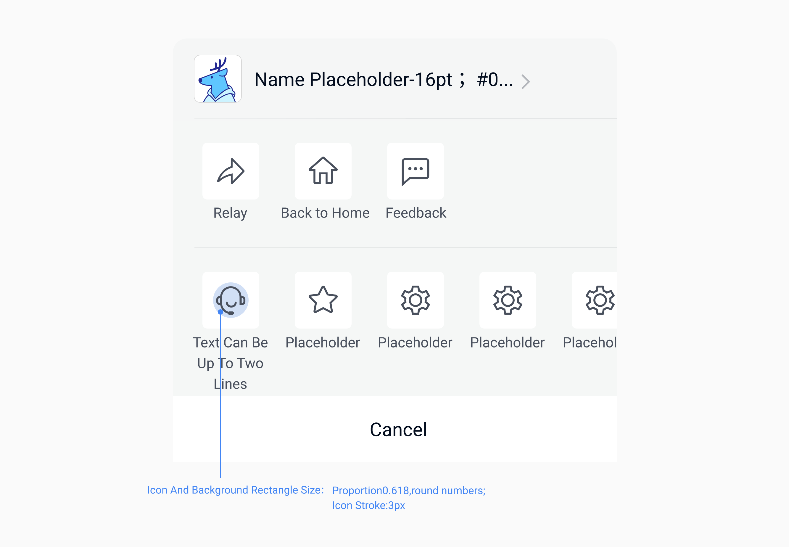 Além dessas três funções básicas de botão, os desenvolvedores também podem inserir outras funções por conta própria. Para as funções inseridas pelos desenvolvedores, siga o design de ícones mostrado abaixo.
