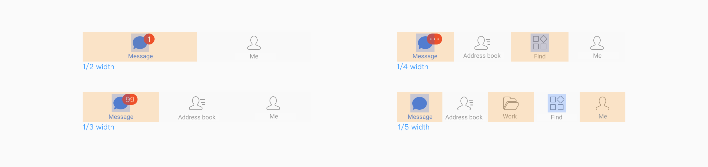 Geralmente fixados na parte inferior para diferentes entradas de paginação. O número de abas não é inferior a 2 e não ultrapassa 5.